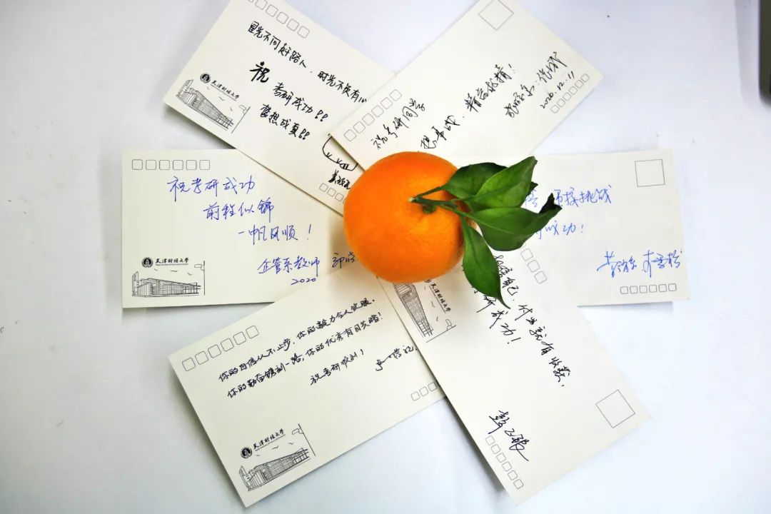 老师们手写的明信片体现出对考研学子的鼓励与殷切希望。小小的福袋祝福大家考试顺利,万事如愿!
