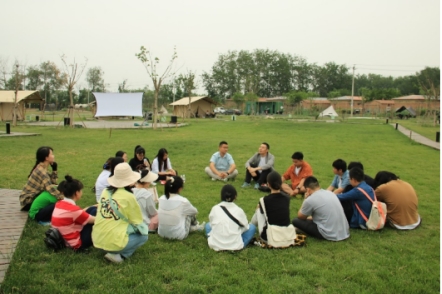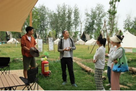 在教学现场,梁强教授从理想村村前种植的小麦引入,向同学们介绍了树蛙部落理想村的由来。树蛙部落理想村,原本是天津市林业和草原局的林果良种场,为了保留乡村原有的韵味,理想村的园区设计最大程度地保留了原有的植被和建筑。随后,梁强教授与理想村的运营负责人杨总一起带领同学们参观了树蛙部落民宿的经典建筑——三角屋、荷叶屋、鸟巢屋。这些民宿均大量采用木色与木质结构,深刻体现了设计者融入乡村的设计理想。