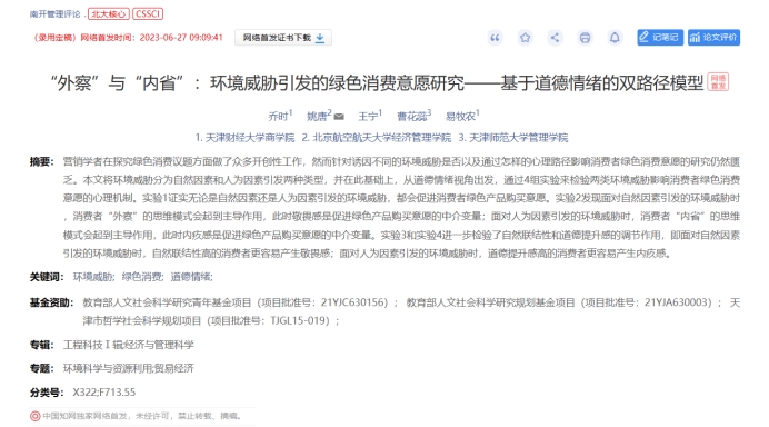 市场营销系乔时副教授团队在国内管理学权威期刊《南开管理评论》网络首发学术论文“‘外察’与‘内省’:环境威胁引发的绿色消费意愿研究——基于道德情绪的双路径模型”。