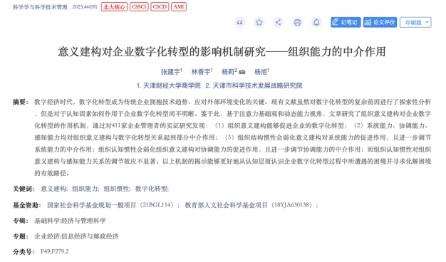 企业管理系张建宇教授与博士生林香宇同学在中文高水平期刊《科学学与科学技术管理》合作发表题为“意义建构对企业数字化转型的影响机制研究——组织能力的中介作用”的论文,世界杯