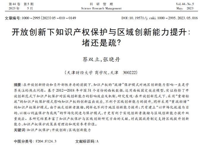 企业管理系蔡双立教授与博士生张晓丹同学在高水平期刊《科研管理》合作发表题为“开放创新下知识产权保护与区域创新能力提升:堵还是疏?”的论文。