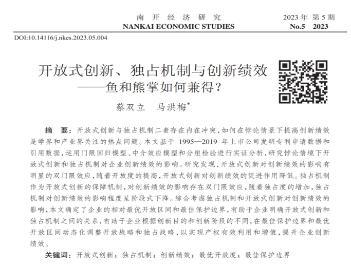 企业管理系蔡双立教授与博士研究生马洪梅在中文高水平期刊《南开经济研究》合作发表题为“开放式创新、独占机制与创新绩效:鱼和熊掌如何兼得?”的论文。