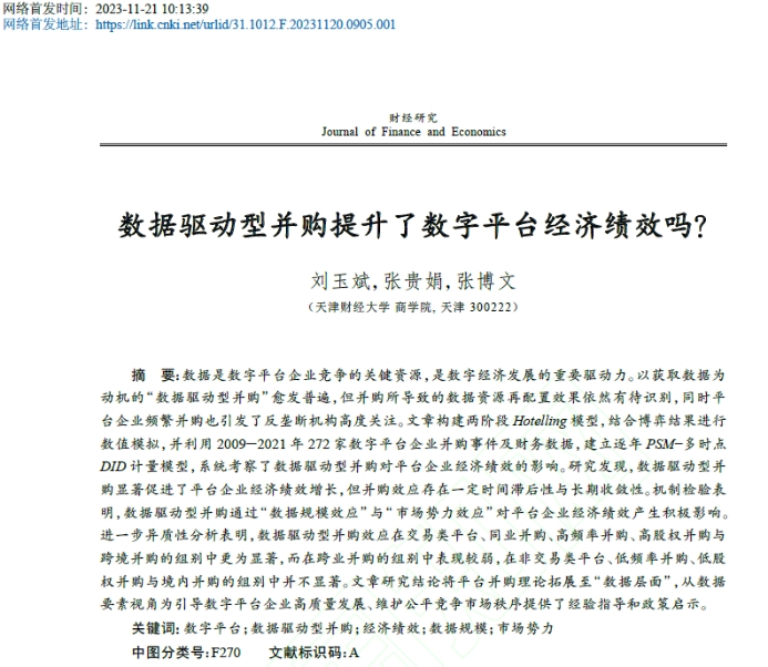 物流与供应链管理系刘玉斌教授与博士研究生张贵娟在中文高水平期刊《财经研究》合作发表题为“数据驱动型并购提升了数字平台经济绩效吗?”的论文。