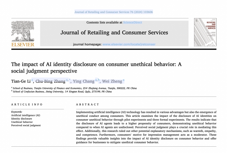 3.《Journal of Retailing and Consumer Services》(ABS2星)——The impact of AI identity disclosure on consumer unethical behavior: A social judgment perspective