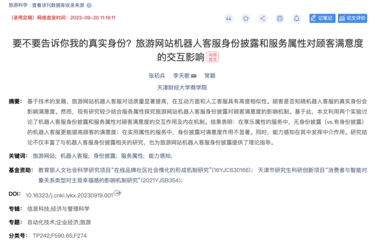 2. 《旅游科学》——要不要告诉你我的真实身份?旅游网站机器人客服身份披露和服务属性对顾客满意度的交互影响