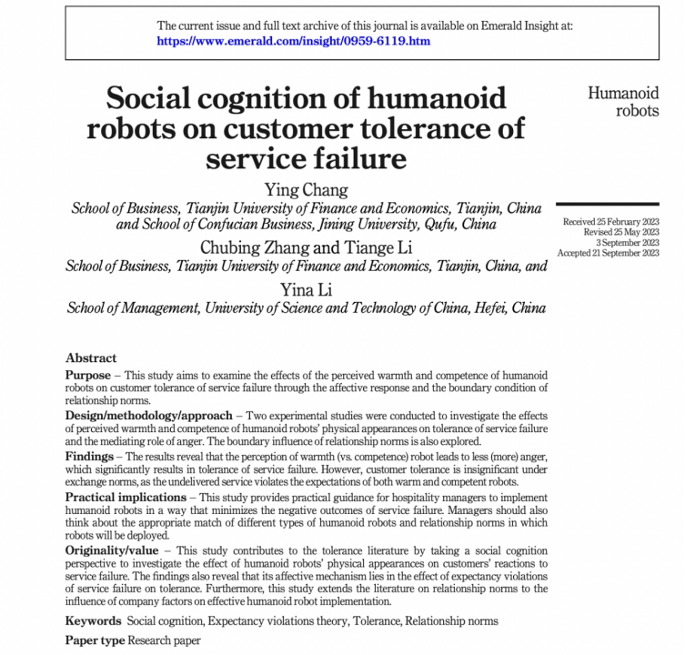 市场营销系张初兵教授在ABS3星期刊《International Journal of Contemporary Hospitality Management》上发表论文“Social cognition of humanoid robots on customer tolerance of service failure”。同时,张初兵教授领衔的全媒运营与智能服务研究团队在2023年9月至10月间在《旅游科学》和《Journal of Retailing and Consumer Services》(ABS2星)发表论文两篇。