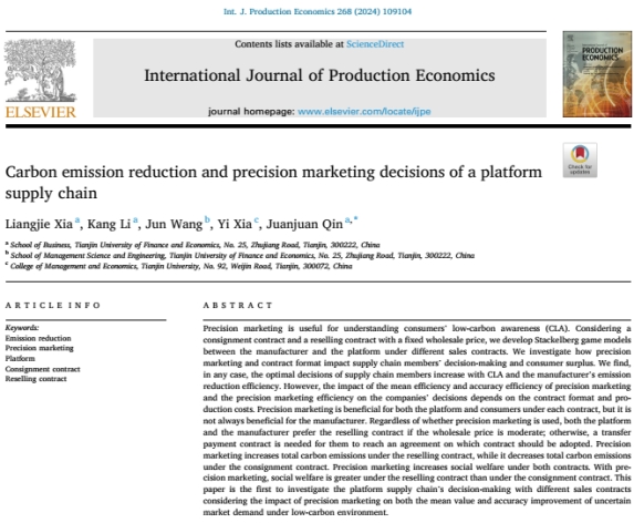 物流与供应链管理系夏良杰教授和硕士生李康在英文高质量期刊《International Journal of Production Economics》合作发表题为“Carbon emission reduction and precision marketing decisions of a platform supply chain”的论文。