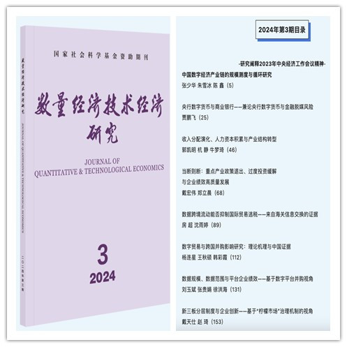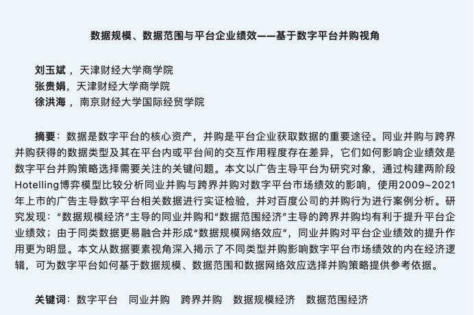徐洪海老师合作在中文高水平期刊《数量经济技术经济研究》发表题为“数据规模、数据范围与平台企业绩效——基于数字平台并购视角”的论文。