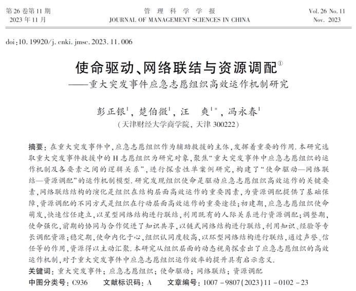 企业管理系彭正银教授与博士生楚伯微、旅游系汪爽老师、企管系冯永春老师合作完成的论文“使命驱动、网络联结与资源调配:重大突发事件应急志愿组织高效运作机制研究”在中文高质量期刊《管理科学学报》发表。