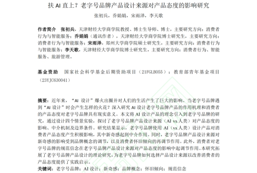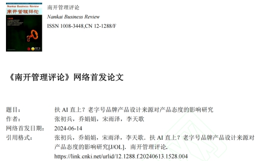 市场营销系张初兵教授与博士生乔娟娟、李天歌以及郑州大学硕士生宋雨泽合作完成的论文“扶 AI 直上?老字号品牌产品设计来源对产品态度的影响研究”在中文高质量期刊《南开管理评论》网络首发。