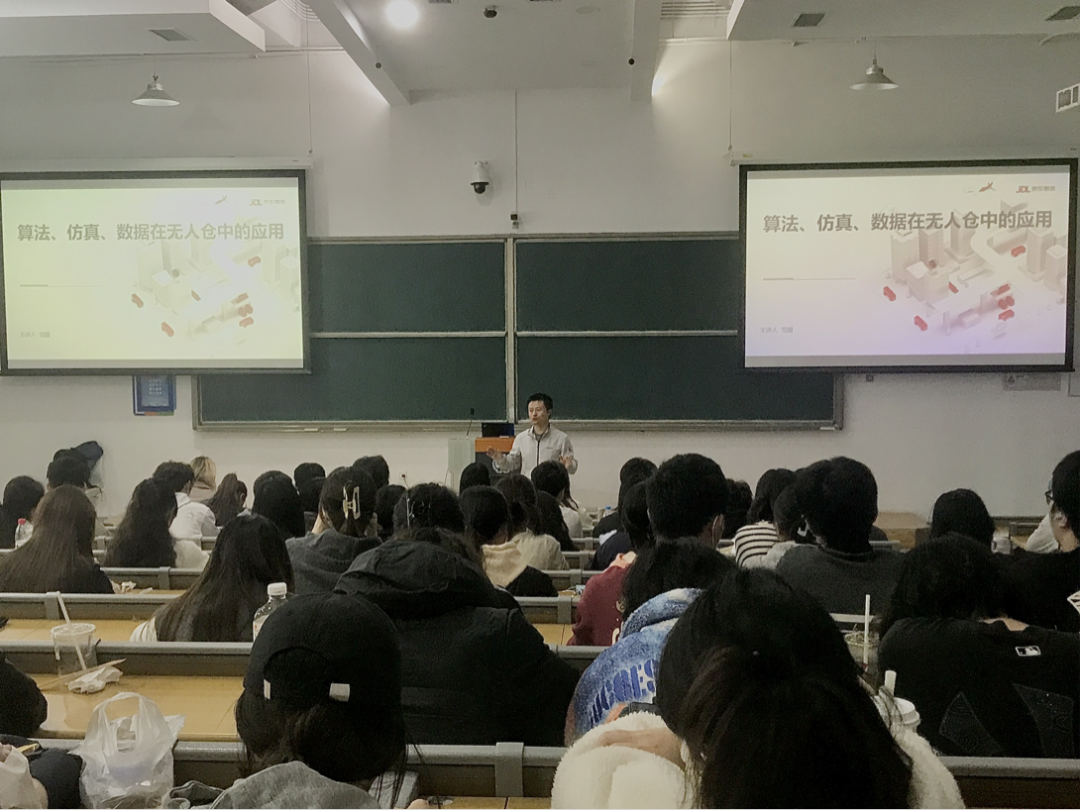 范博士为同学们讲解了算法、仿真、数据在无人仓中的具体应用,讲述了智能仓储中的选品、储存、拣选算法、基于“顺风车”模型的设备调度算法以及数据分析与挖掘在无人仓中的价值与应用。同时,他还分析了物流专业学生的未来职业规划。