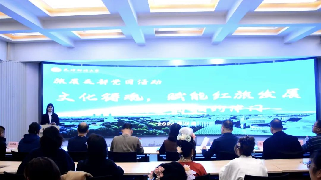 旅游系主任张威、河南洛邑文化旅游发展有限公司副总经理张乾、旅游系师生代表及旅展党支部全体党员参加,支部书记阿迪拉老师主持。