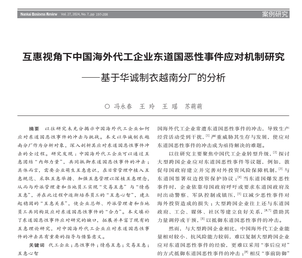 企业管理系冯永春副教授和王玲博士在国内高质量期刊《南开管理评论》发表学术论文“互惠视角下中国海外代工企业东道国恶性事件应对机制研究”。