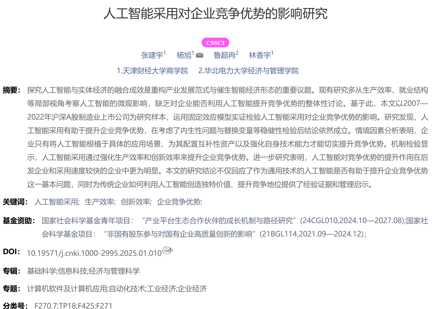 企业管理系张建宇教授及其博士生杨旭、林香宇在国内高水平期刊《科研管理》合作发表题为“人工智能采用对企业竞争优势的影响研究”的论文,华北电力大学经济与管理世界杯
