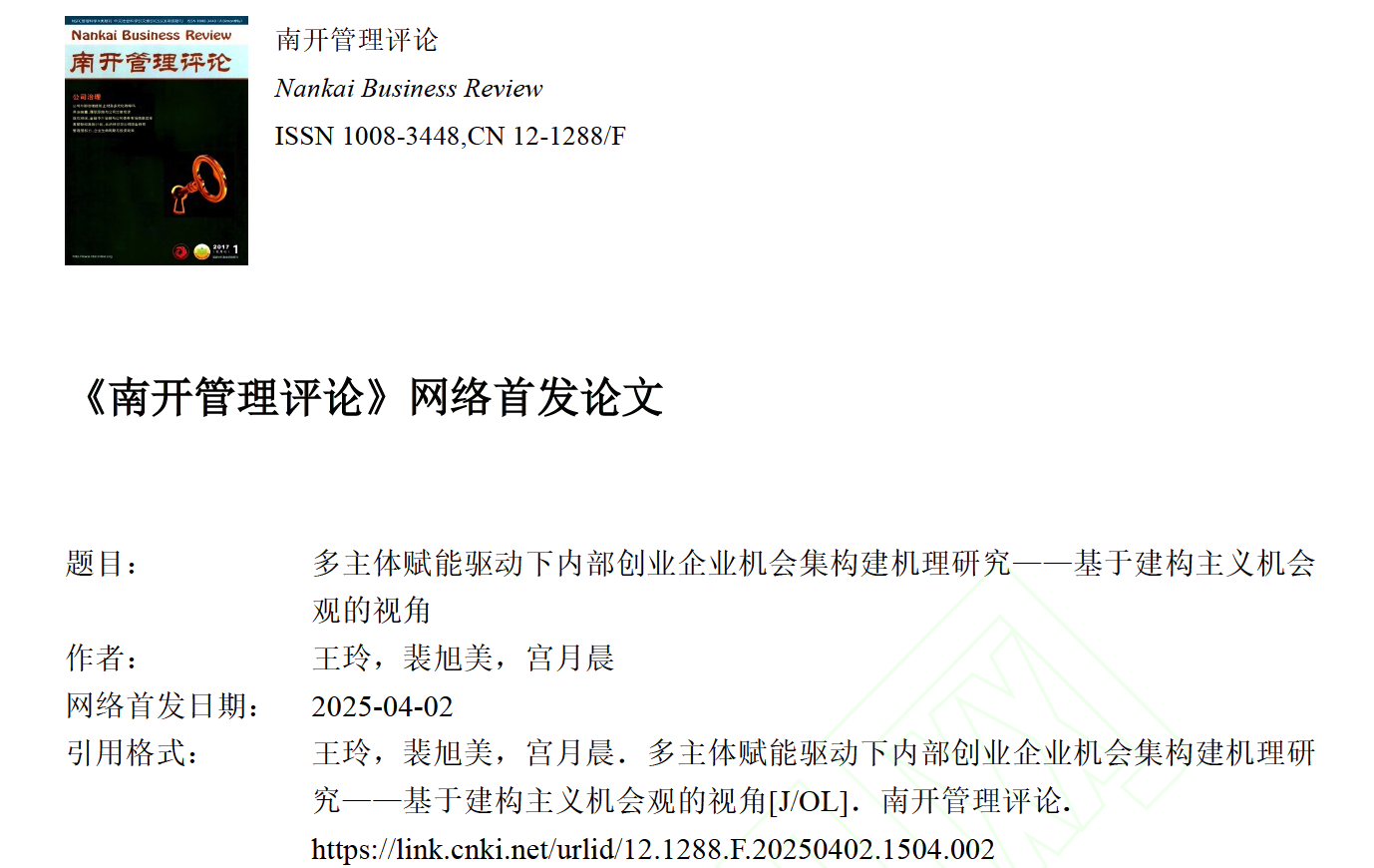 企业管理系王玲副教授团队在国内高质量期刊《南开管理评论》网络首发学术论文“多主体赋能驱动下内部创业企业机会集构建机理研究——基于建构主义机会观的视角”。