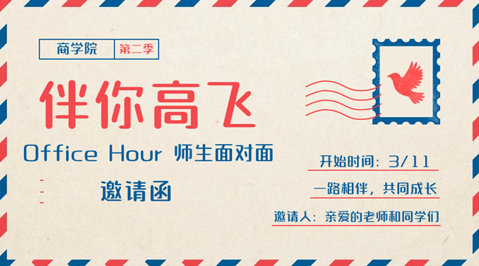 坚持围绕立德树人根本任务,深化“三全育人”机制建设,充分发挥教师“四个引路人”作用,创新为学生办实事的方法,开展“伴你高飞”系列活动。“Office Hour”作为“伴你高飞”系列活动之一,为学生与老师的日常交流搭建平台,为同学们解决学业、科研、职业规划等各类成长中的困惑和问题,从而进一步提升商院学子的专业认同感,促进世界杯