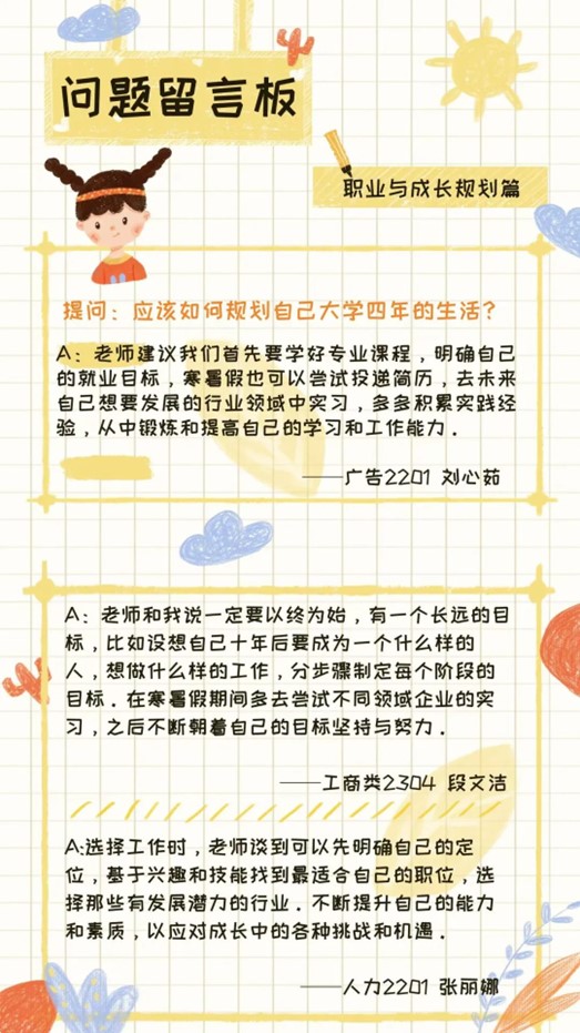 未来也将继续提供更多类似的机会,为同学们的发展指路,陪伴同学们在接下来的学习与生活中成长。感谢老师与同学们的积极参与,我们下学期再见!