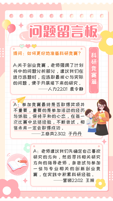 在“问题留言板”环节,大家的困惑多集中于科研竞赛、读研深造、职业与成长规划等方面,同学们在一次次与老师的面对面沟通中迸发新的思考,收获满满。在活动中老师们将自己丰富的经验向同学们倾囊相授,对同学们提出的各方面的问题都耐心热情地给予了解答。