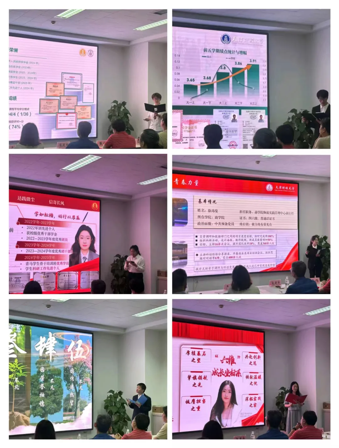 此次面试评审分为个人展示和答辩两个环节。在自我展示环节中,各位候选人尽展独特风采。有的同学专业排名前列、奖学金与荣誉加身;有的同学在学生工作中展现出色的组织协调与领导能力,活跃于校园活动与社团事务;有的同学积极投身科研创新,入选骨干班,彰显探索精神;还有的同学秉持坚定信念,在服务同学与自我成长中践行责任担当。
