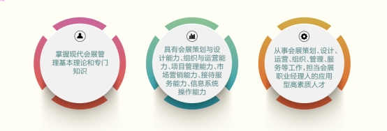 培养目标 本专业培养掌握现代会展管理基本理论和专门知识,具有会展策划与设计能力、会展组织与运营能力、会展项目管理能力、会展市场营销能力、会展接待服务能力、会展信息系统操作能力,从事会展策划、设计、运营、组织、管理、服务等工作,担当会展职业经理人的应用型高素质人才。