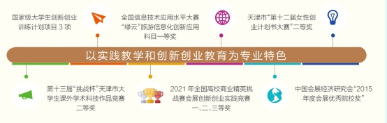办学特色 本专业教学成果丰硕,在大学生创新创业项目、全国信息技术应用大赛、全国会展创新创业大赛、“挑战杯”竞赛上均有佳绩,并荣获中国会展经济研究会颁发的“会展优秀院校奖”。与国家会展中心、北京北辰会展集团、天津贸促会、天津梅江会展中心、尚融品牌传播机构、天津尚武文化公司等会展企事业单位共建实践教学基地,突出学生实践能力的培养。