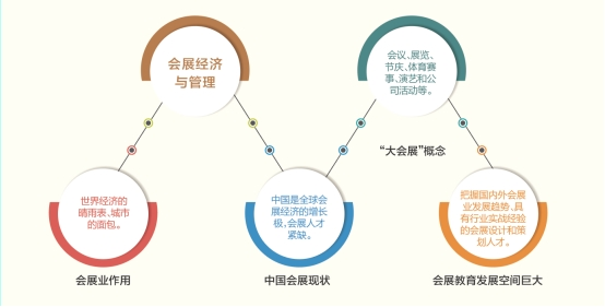 会展经济与管理 认识专业 作为现代化、高端性、知识型服务业,在全球范围内会展业都是经济发展的助推器和新亮点。我国作为会展经济的增长极,会议、展览、节庆、赛事、演艺和公司活动等方兴未艾,行业经济效益逐年攀升。而且,会展对交通、旅游、餐饮、住宿等相关产业具有强大的产业带动效应。