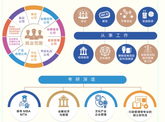 毕业生去向 学生可以在会议公司、展览公司、会展场馆公司、会展服务公司、差旅管理公司、节庆礼仪公司、文化传播公司、广告传媒公司、活动策划与组织公司以及旅行社、酒店的会展事业部和相关政府部门、行业协会等从事会议、展览、节事活动、场馆租赁、奖励旅游、文化演艺、博物馆等项目的市场调研、创意策划和组织管理等工作。